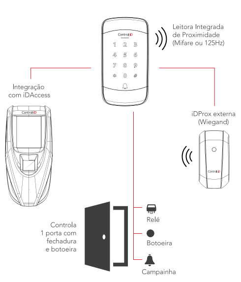 O iDTouch Prox é um controlador de acesso que utiliza senhas ou cartões de proximidade (RFID) para autenticar seus usuários. Seu teclado capacitivo retroiluminado facilita a leitura dos números e a digitação do código de identificação pessoal.