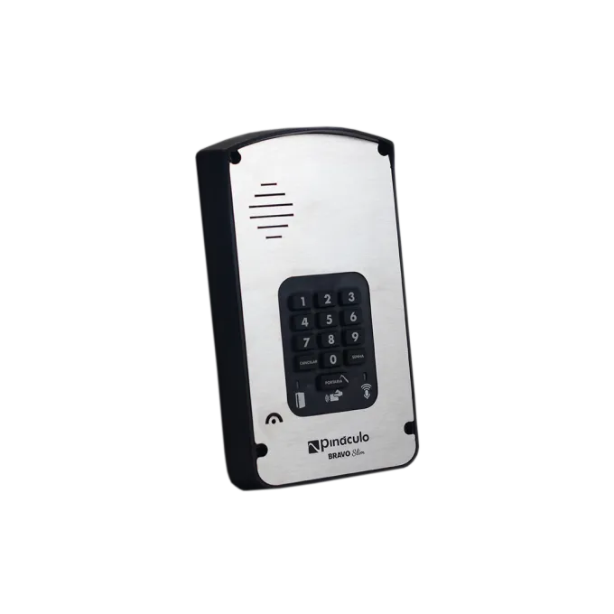 O Bravo slim é um porteiro eletrônico que possui a central de interfonia celular integrada, sendo o único equipamento necessário para a implantação de um sistema completo de interfonia e controle de acesso. O Bravo slim permite o cadastro de 50 residências com 4 números de telefones móveis ou fixos para cada uma.